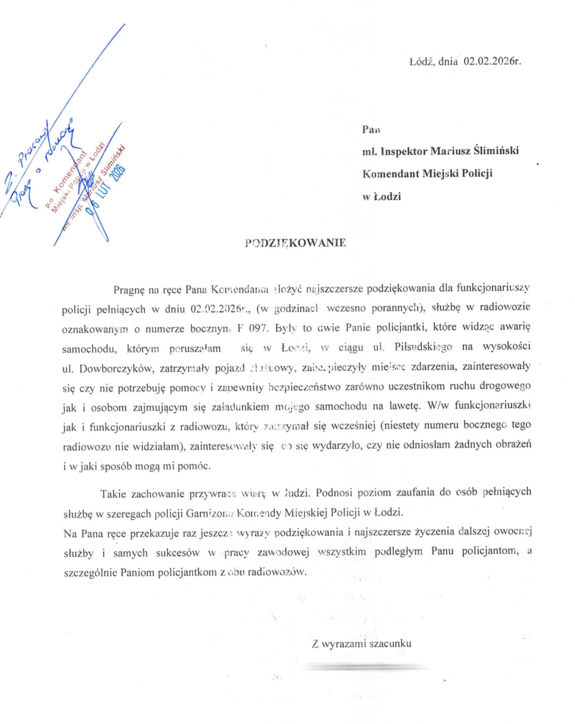 Pełniący obowiązki Komendanta Miejskiego Policji w Łodzi – mł. insp. Mariusz Ślimiński, pocztą elektroniczną, otrzymał list z podziękowaniem dla policjantek z Wydziału Ruchu Drogowego łódzkiej komendy. Każde miłe słowo motywuje nas do jeszcze skuteczniejszego działania na rzecz poprawy bezpieczeństwa mieszkańców naszego miasta.