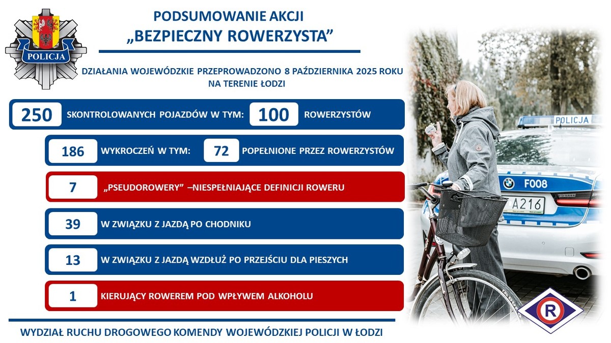 8 października 2025 roku przeprowadzono działania kontrolno-prewencyjne pod nazwą „Bezpieczny Rowerzysta”, koordynowane przez Wydział Ruchu Drogowego Komendy Wojewódzkiej Policji w Łodzi. Ich celem było zwiększenie bezpieczeństwa niechronionych uczestników ruchu drogowego oraz egzekwowanie przepisów prawa drogowego w relacjach kierujący – rowerzysta.