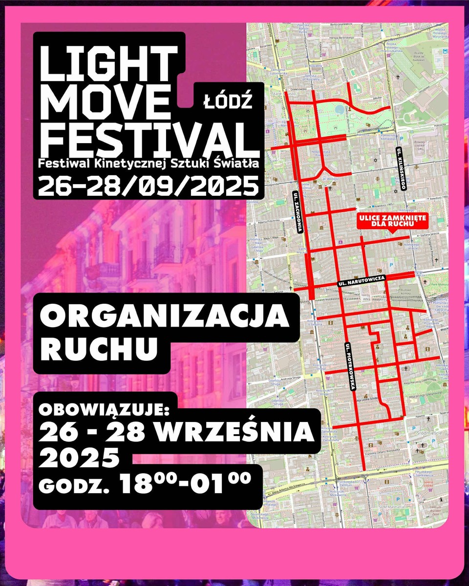 W ostatni weekend września odbywać się będzie w Łodzi jubileuszowy - XV „Festiwal Kinetycznej Sztuki Światła - Light Move Festiwal 2025”. W związku z koniecznością zapewnienia bezpieczeństwa uczestnikom wydarzenia na wielu ulicach w centrum Łodzi zmieniona zostanie organizacja ruchu. Wprowadzone na czas festiwalu zmiany, obowiązywać będą w godzinach 18:00 – 01:00.