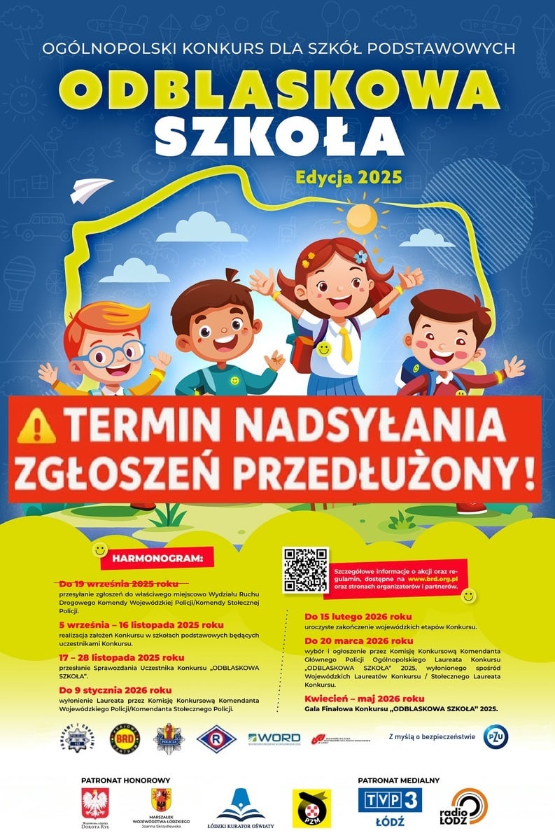 Z uwagi na bardzo dużą liczbę zgłoszeń oraz ogromne zainteresowanie konkursem „Odblaskowa Szkoła”, podjęto decyzję o przedłużeniu terminu nadsyłania zgłoszeń. Bezpieczeństwo dzieci na drodze stanowi wartość nadrzędną. Cieszy nas fakt, iż tak wiele szkół chce aktywnie uczestniczyć w działaniach na rzecz poprawy bezpieczeństwa i promowania noszenia elementów odblaskowych.