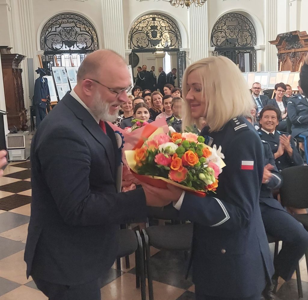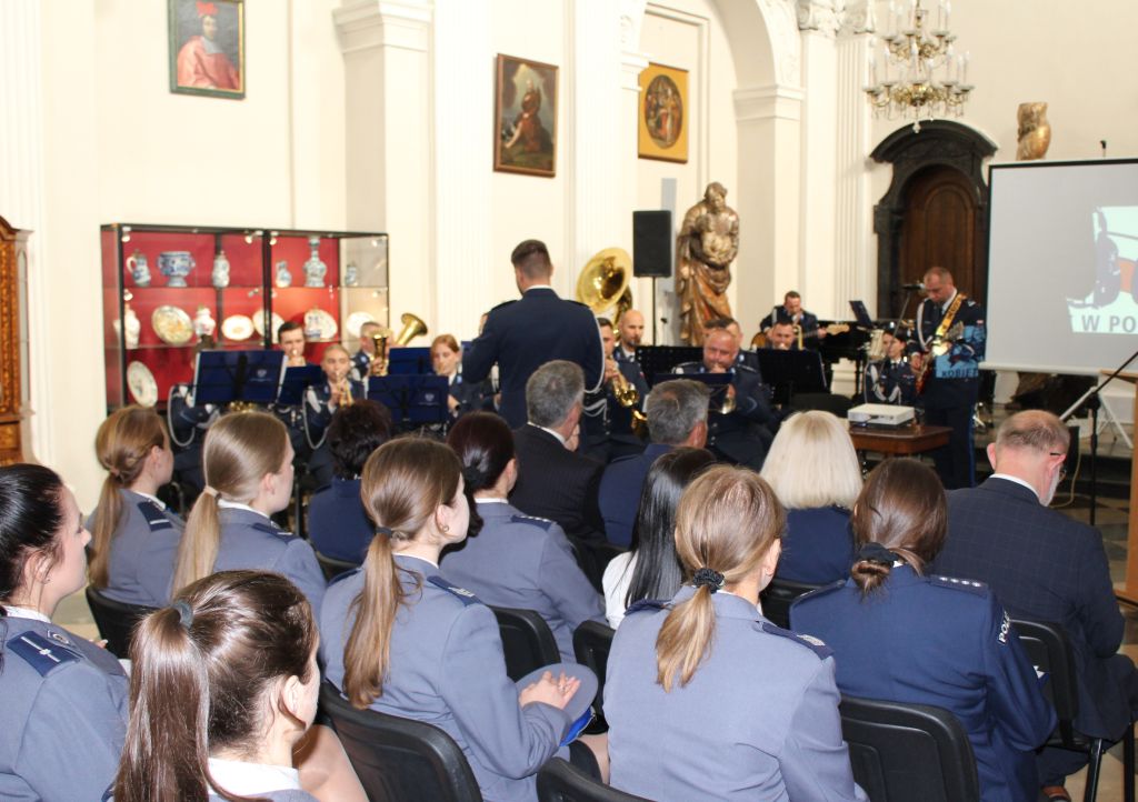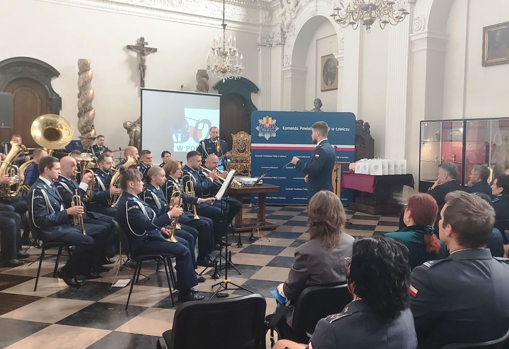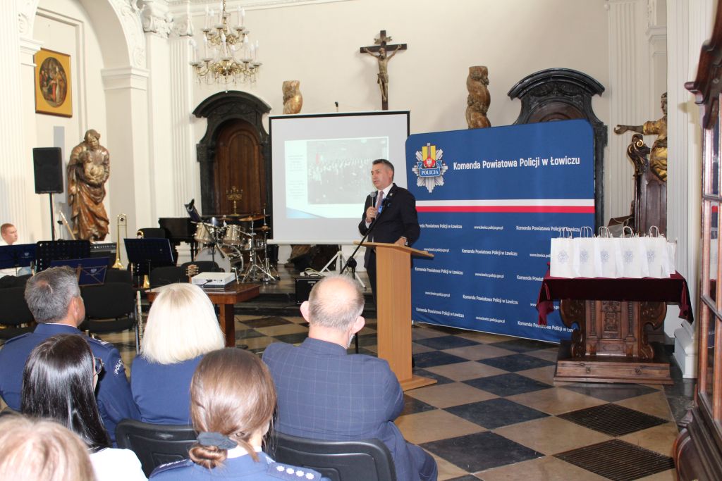 Następnie głos zabrał Jarosław Olbrychowski – Prezes Stowarzyszenia Rodzina Policyjna 1939 w Łodzi - członek Rady Historycznej Komendanta Głównego Policji, który przedstawił zarys historyczny kobiecej policji. 100 lat temu, dokładnie 26 lutego 1925 roku, Minister Spraw Wewnętrznych Cyryl Ratajski polecił utworzyć policję kobiecą, a kilka tygodni później 15 kwietnia 1925 roku w Komendzie Głównej Policji Państwowej w Warszawie rozpoczął się kurs specjalny dla policjantek, gdzie zostało przeszkolonych 30 kobiet, głównie pod kątem walki z nierządem, sutenerstwem, handlem żywym towarem. W dalszej części Michał Zalewski – Dyrektor Muzeum w Łowiczu przybliżył historię działalności Polskiej Policji Państwowej w okresie 20-lecia międzywojennego na naszym terenie. Wystąpił również gość specjalny – asp. sztab. Kinga Dłużak-Osiadacz, córka byłej, nieżyjącej Komendant Policji w stopniu podinspektora – Elżbiety Dłużak. Przybliżyła nam współczesną, aczkolwiek historyczną dla kobiet policjantek postać swojej mamy. Wydarzenie uświetnił przepiękny koncert orkiestry reprezentacyjnej policji garnizonu łódzkiego, pod batutą Kamila Sztrait – Wlaźlaka, zadedykowany wszystkim policjantkom i pracownicom cywilnym naszej jednostki. Głos zabrał również Zastępca Komendanta Powiatowego Policji w Łowiczu – mł. insp. Maciej Wasilewski, który w imieniu męskiej części kierowniczej podziękował policjantkom za ich służbę oraz pracownicom cywilnym łowickiej komendy. Pani Komendant otrzymała Medal „85. Rocznicy Zbrodni Katyńskiej” z rąk Prezesa Stowarzyszenia „Rodzina Policyjna 1939 r.” w Łodzi – Jarosława Olbrychowskiego - odznaczenie za zasługi w upamiętnianiu funkcjonariuszy Policji Państwowej II RP. W Komendzie Powiatowej Policji w Łowiczu obecnie służbę pełni 31 funkcjonariuszek. Zajmują różne stanowiska, mają różny staż służby, pracują we wszystkich pionach. Pełnią służbę na drogach, ścigając piratów drogowych i przestępców, podejmują interwencje domowe, patrolują ulice miasta i gmin, uczestniczą w zabezpieczeniach imprez masowych i pracują z dziećmi i młodzieżą. Mają swoje pasje, swoje obowiązki, które czasem muszą ustąpić obowiązkowi służby. Są żonami, matkami, ale niejednokrotnie muszą odejść od świątecznego stołu, aby stawić się na służbę. Pełnią służbę w dzień i w nocy, w dni powszednie i świąteczne. Realizują swoje zadania z wielkim zaangażowaniem, wspólnie ze swoimi kolegami policjantami. W strukturach łowickiej komendy są również pracownice cywilne, obecnie jest ich 20 w tutejszej jednostce. Ich codzienna praca – chodź często mniej widoczna niż służba mundurowych – jest ogromnym wsparciem i jest niezbędna do prawidłowego funkcjonowania całej formacji. To obecne tu Panie dbają o sprawną obsługę administracyjną, finansową i techniczną, wspierają działania logistyczne i informacyjne. Pracownice cywilne swoją wiedzą i kompetencjami wspierają funkcjonowanie jednostki.