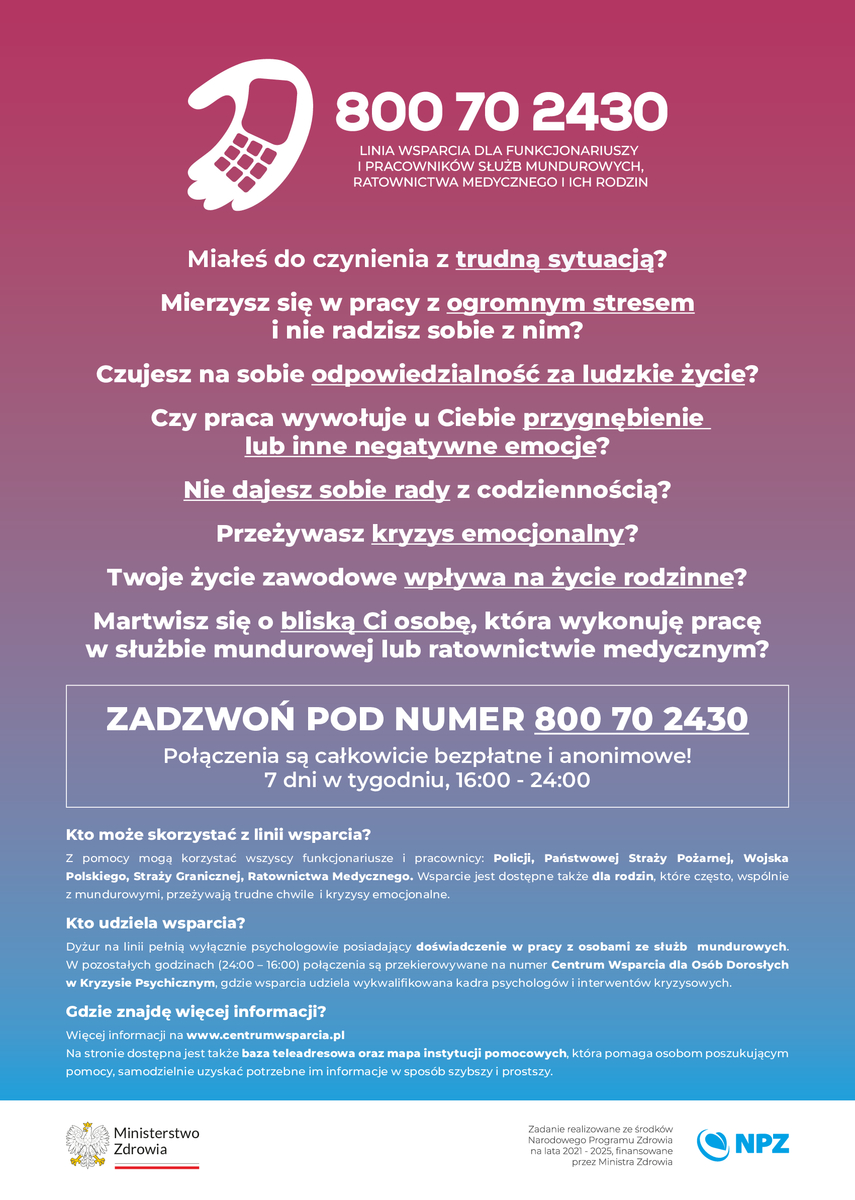 Linia Wsparcia Psychologicznego dla Funkcjonariuszy i Pracowników Służb Mundurowych, Ratownictwa Medycznego i ich Rodzin. Celem działalności linii jest udzielanie wsparcia psychologicznego funkcjonariuszom i pracownikom służb mundurowych, w tym Policji, oraz najbliższym członkom ich rodzin. W ramach działalności linii można również uzyskać informacje o miejscach, w których udzielana jest pomoc długoterminowa.