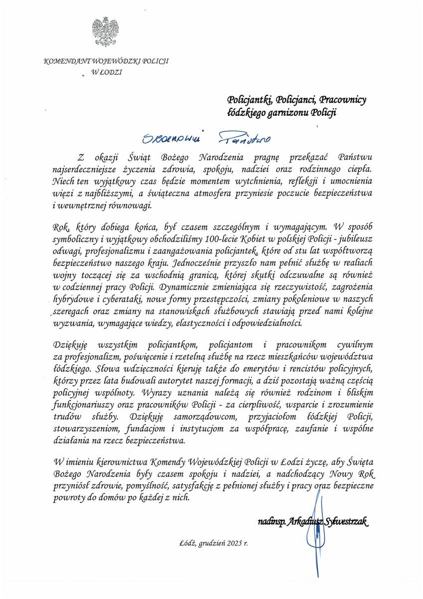 "W imieniu kierownictwa Komendy Wojewódzkiej Policji w Łodzi życzę, aby Święta Bożego Narodzenia były czasem spokoju i nadziei, a nadchodzący Nowy Rok przyniósł zdrowie, pomyślność, satysfakcję z pełnionej służby i pracy oraz bezpieczne powroty do domów po każdej z nich. "