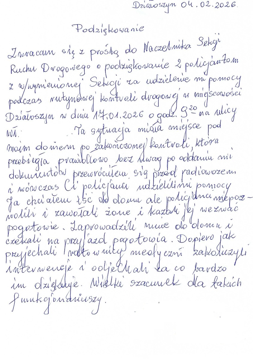 Podziękowania nawiązywały do kontroli drogowej przeprowadzonej 17 stycznia 2026 roku na jednej z ulic w Działoszynie. Policjanci zwrócili uwagę na pojazd zaparkowany na chodniku. Po rozmowie z kierującym ustalili, że zatrzymał się on jedynie na chwilę przed swoją posesją. Funkcjonariusze wykonali czynności służbowe w sposób prawidłowy, rzetelny i bez żadnych zastrzeżeń. Nic nie wskazywało na to, że chwilę później sytuacja przybierze dramatyczny obrót.