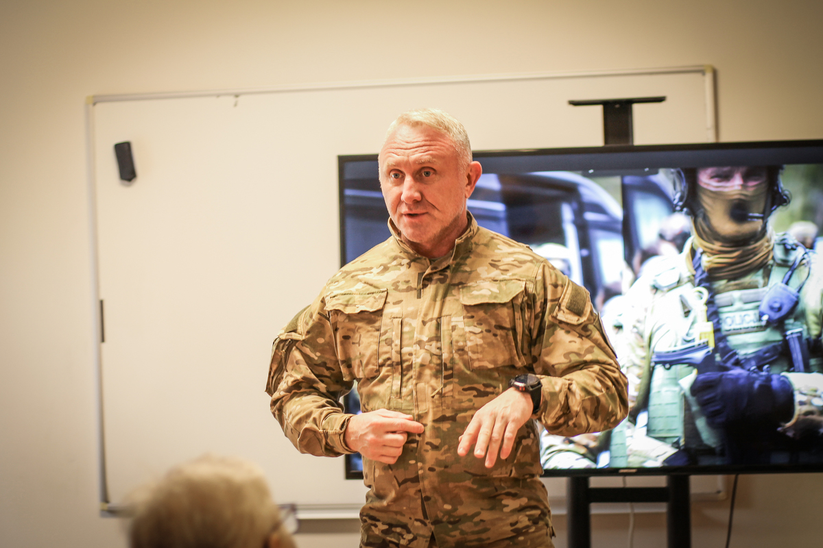 Dowódca Samodzielnego Pododdziału Kontrterrorystycznego Policji w Łodzi mł. insp. Krzysztof Jarmusz poprowadził, skierowany do seniorów, wykład pt. „Współczesne aspekty terroryzmu w Polsce”.