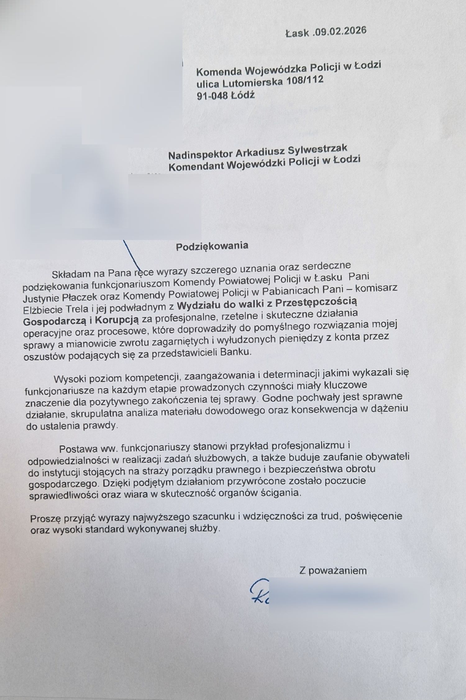 Na ręce nadinspektora Arkadiusza Sylwestrzaka Komendanta Wojewódzkiego Policji w Łodzi wpłynęły pisemne podziękowania za profesjonalne i skuteczne działania funkcjonariuszy z Komendy Powiatowej Policji w Pabianicach oraz Komendy Powiatowej Policji w Łasku. Ich nadawca wyraził słowa uznania za rzetelnie przeprowadzone czynności w sprawie dotyczącej oszustwa. 58-latek pod namową przestępców zainstalował ogólnodostępną aplikację do zdalnej obsługi pulpitu. Przestępcy szybko wykorzystali nadążającą się okazję i wykonując dwa przelewy, uszczuplili konto pokrzywdzonego o kwotę 56 tysięcy złotych. Współpraca pomiędzy jednostkami oraz szybkie i sprawne działanie pabianickich policjantów z Wydziału do Walki z Przestępczością Gospodarczą i Korupcją doprowadziło do wstrzymania transakcji i odzyskania skradzionych pieniędzy.