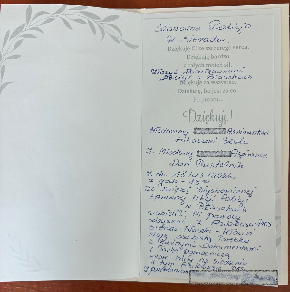 Do Komendanta Powiatowego Policji w Sieradzu – insp. Piotra Bielewskiego – wpłynęły podziękowania od wdzięcznej mieszkanki Zduńskiej Woli dla policjantów z komisariatu w Błaszkach – mł. asp. Darii Pustelnik i mł. asp. Łukasz Szulca, za szybką i skuteczną pomoc w odzyskaniu torebki z ważnymi dokumentami. Dziękujemy za docenianie naszych funkcjonariuszy, jest to dla nich ogromna satysfakcja, która wzmacnia poczucie sensu pełnionej służby i stanowi silną motywację do dalszego zaangażowania i pomocy