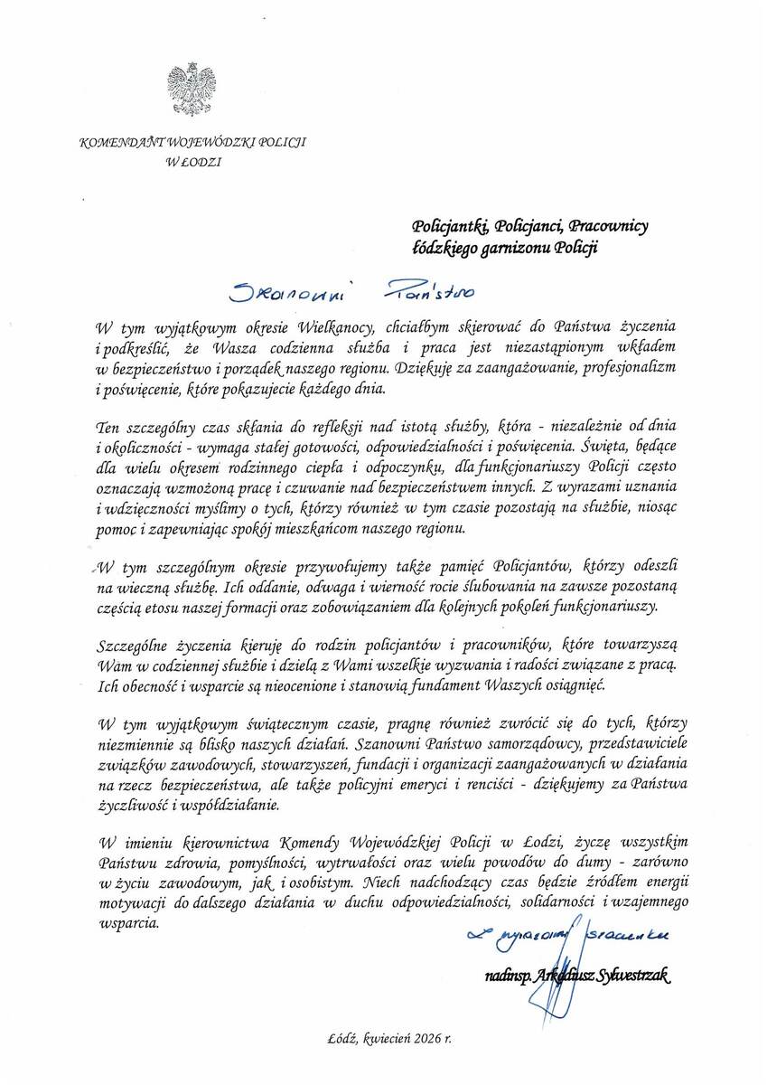 "W tym wyjątkowym okresie Wielkanocy, chciałbym skierować do Państwa życzenia i podkreślić, że Wasza codzienna służba i praca jest niezastąpionym wkładem w bezpieczeństwo i porządek naszego regionu. Dziękuję za zaangażowanie, profesjonalizm i poświęcenie, które pokazujecie każdego dnia. "