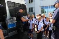Wolborscy dzielnicowi rozpoczęli dzisiejsze spotkanie od przedstawienia specyfiki pracy mundurowych. Z dużym zaciekawieniem mali goście obejrzeli radiowóz wykorzystywany w służbie przez Oddział Prewencji Policji w Łodzi. W ramach spotkania dzieci obejrzały niebieski pokój, miejsce gdzie przesłuchuje się właśnie najmłodszych. Dzieci zadawały wiele pytań wskazujących na duże zainteresowanie pracą policjantów. Gdy wycieczka dobiegła końca mali gości wyszli na plac komendy, gdzie mogli wsiąść do policyjnych radiowozów. Na zakończenie wycieczki funkcjonariusz z wydziału patrolowo- interwencyjnego zaprezentował pracę policyjnego psa.