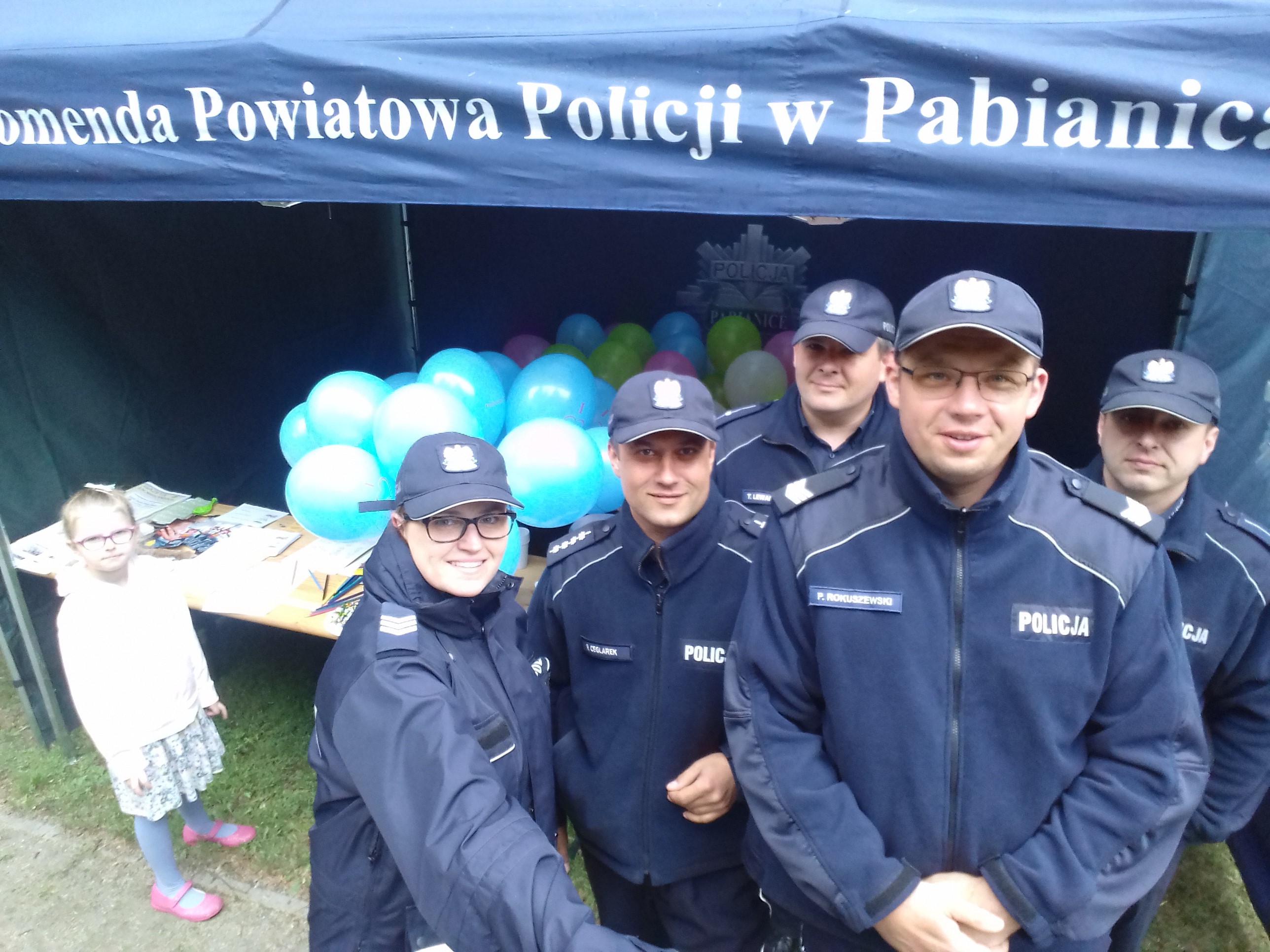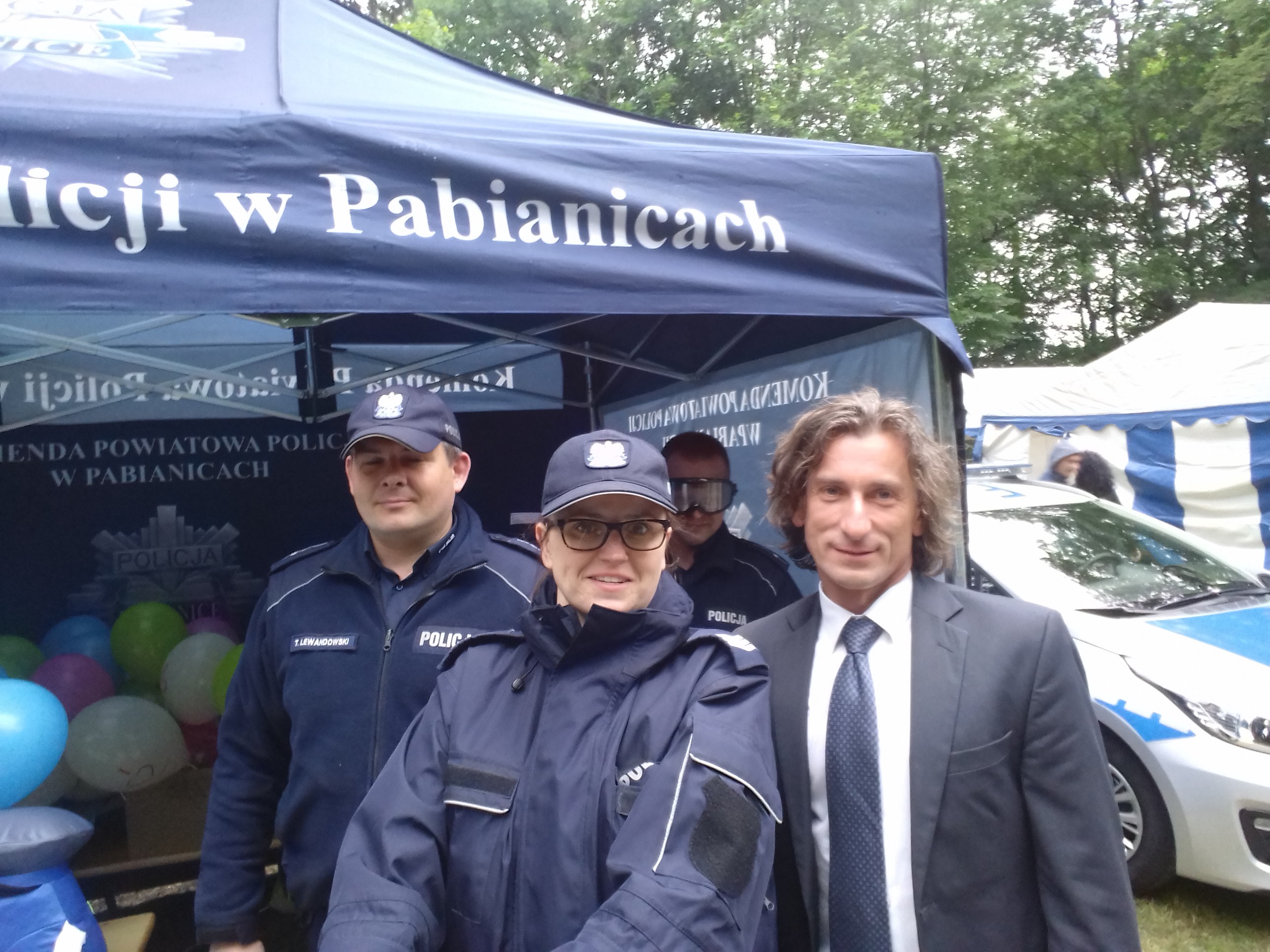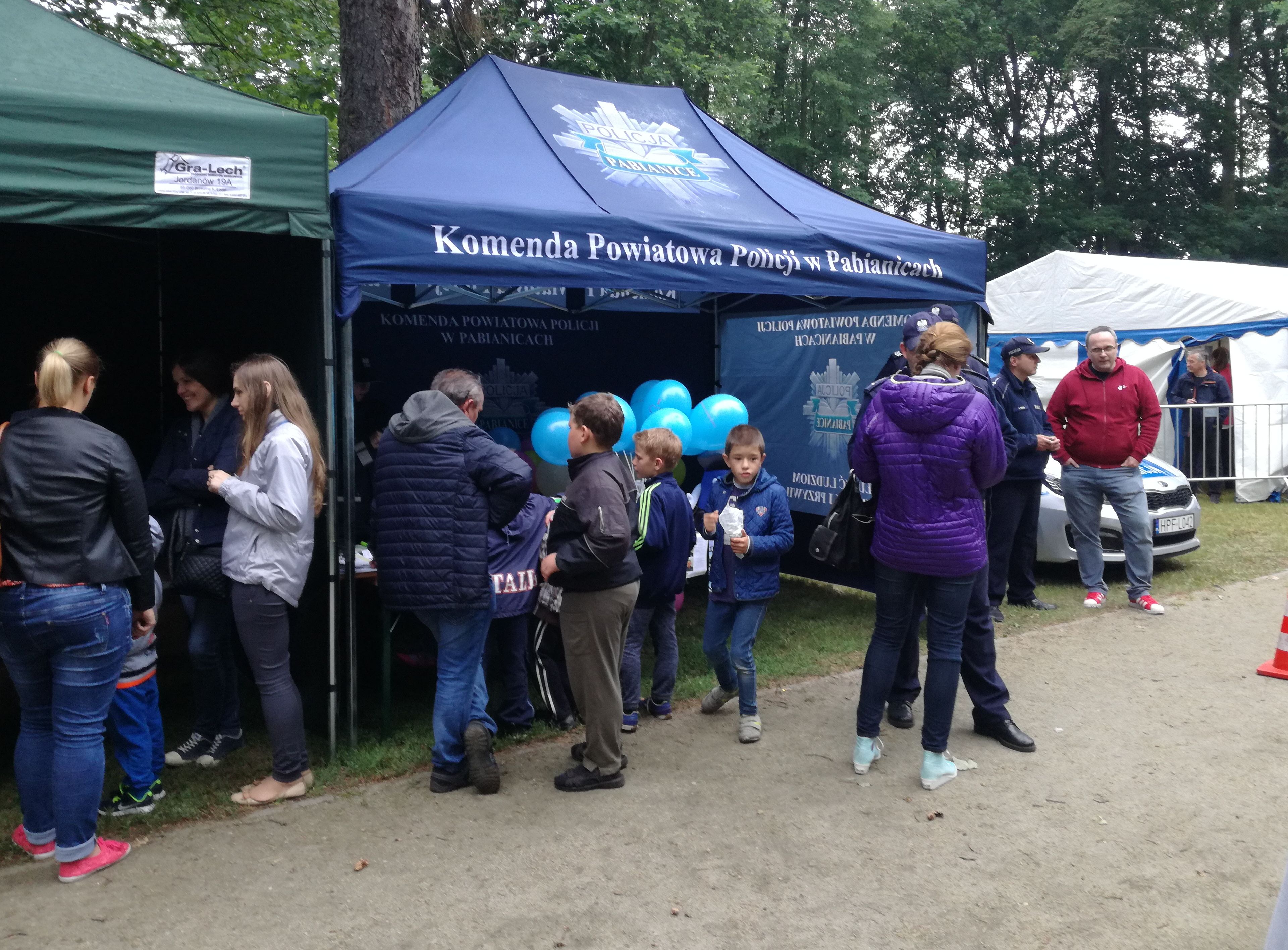 Podczas Dni Dobronia, wśród namiotów wielu wystawców nie zabrakło stoiska w barwach policyjnych. Pod granatowym namiotem Komendy Powiatowej Policji w Pabianicach na mieszkańców czekało wiele atrakcji. Każdy mógł usiąść za kierownicą radiowozu lub motocykla, włączyć sygnały, ubrać elementy policyjnego munduru i poczuć się jak prawdziwy policjant. Sprzęt policyjny cieszył się dużym zainteresowaniem nie tylko wśród najmłodszych, ale też dorosłych. Na dzieci prócz dawki wiedzy o bezpieczeństwie czekały niespodzianki. Milusińscy po namalowaniu prac związanych z policyjną tematyką otrzymywali od mundurowych elementy odblaskowe ufundowane przez wójta gminy Dobroń, a także baloniki i słodycze. Niewątpliwą atrakcją dla odwiedzających policyjne stoisko były alkogogle. Dzięki temu urządzeniu w atmosferze świetnej zabawy każdy kierowca mógł uświadomić sobie, jakim zagrożeniem jest jazda na podwójnym gazie. Smaczku tej niepowtarzalnej lekcji dodawała pozornie prosta konkurencje polegająca na slalomie między pachołkami, która przy zaburzonej koordynacji wzorkowo-ruchowej stała się nie lada wyzwaniem. Sobotni festyn stworzył też możliwość promowania programu prewencyjnego „Dzielnicowy bliżej nas”. Trzej dzielnicowi z Posterunku Policji w Piątkowisku byli dla mieszkańców na wyciągnięcie ręki. W rozmowach poruszali zagadnienia związane z prewencją kryminalną oraz przybliżali mieszkańcom funkcjonowanie aplikacji moja komenda i krajowej mapy zagrożeń bezpieczeństwa. Mieszkańcy mogli również porozmawiać z będącym na miejscu szefem pabianickiej policji insp. Cezarym Petrusem oraz kierownikiem miejscowego posterunku asp. szt. Rafałem Ceglarkiem.
