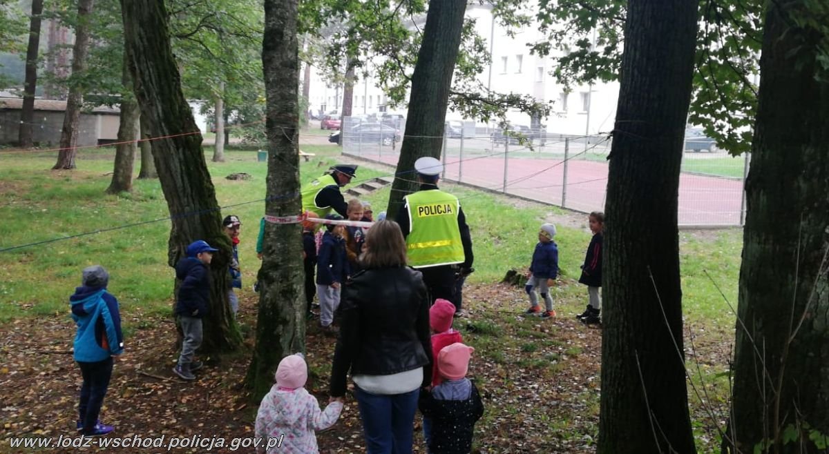 • Policjanci pokazują przedszkolakom jak właściwie zachowywać się na drodze i przez nią przechodzić.