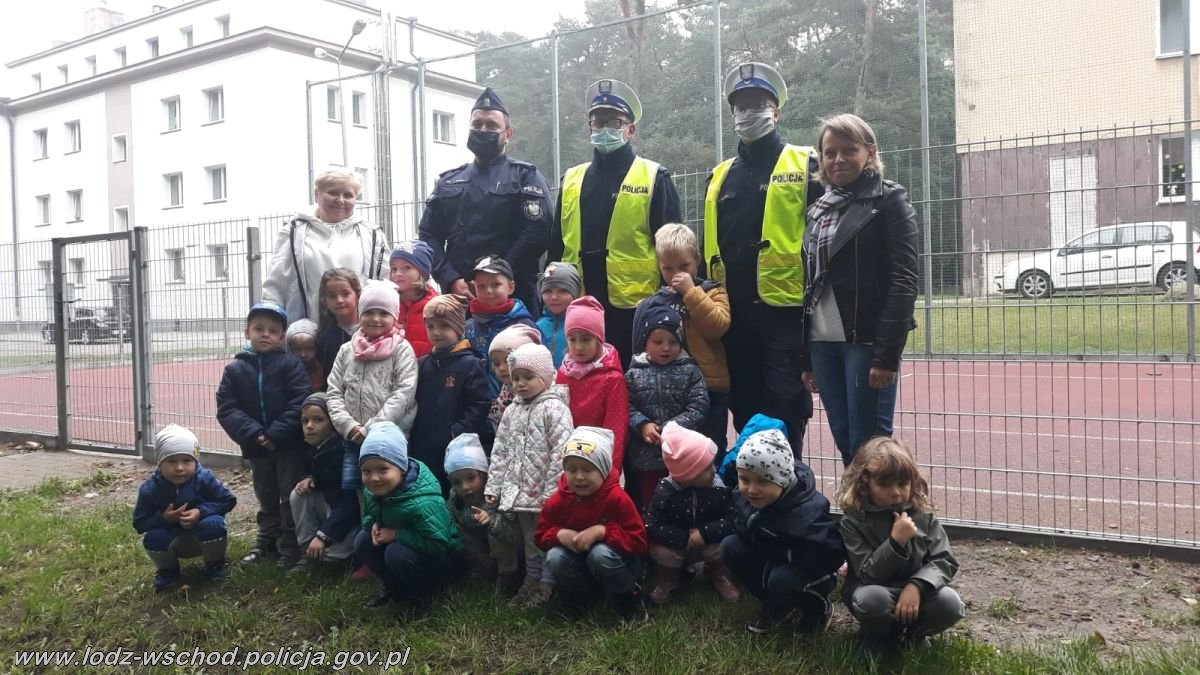 • Policjanci z przedszkolakami robią wspólne zdjęcie.