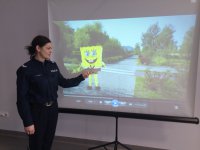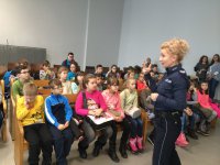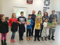 Policjanci z wydziału narkotykowego i ruchu drogowego wspólnie z przedstawicielką Urzędu Miasta rozpoczęli dzisiejsze spotkanie od prelekcji na temat bezpiecznych zachowań podczas ferii zimowych. Z dużym zaciekawieniem mali goście obejrzeli znaną kreskówkę z PanczBobem, która pokazuje podstawowe zasady dotyczące ruchu drogowego. Film przybliżył maluchom ważne informacje związane z bezpiecznym zachowaniem „na drodze” oraz w sposób ciekawy omówił istotę noszenia odblasków. W ramach dzisiejszego spotkania dzieci wzięły też udział w konkursie plastycznym, którego zadaniem było przedstawić bezpieczną i ciekawą formę wypoczynku podczas zimowych ferii. Zwycięzcy przygotowanych konkursów otrzymali nagrody w postaci książek i tornistrów, które ufundował Urząd Miasta w Piotrkowie Trybunalskim. Uczniom, którym troszkę się nie powiodło policjanci wręczyli nagrody pocieszenia- słodkie czekolady. Podczas spotkania dzieci zadawały wiele pytań wskazujących na duże zainteresowanie pracą policjantów. Gdy wycieczka dobiegła końca mali gości wyszli na plac komendy, gdzie mogli wsiąść do policyjnych radiowozów. Na zakończenie wycieczki funkcjonariusz z wydziału patrolowo- interwencyjnego zaprezentował policyjnego pieska o imieniu Deron.
