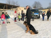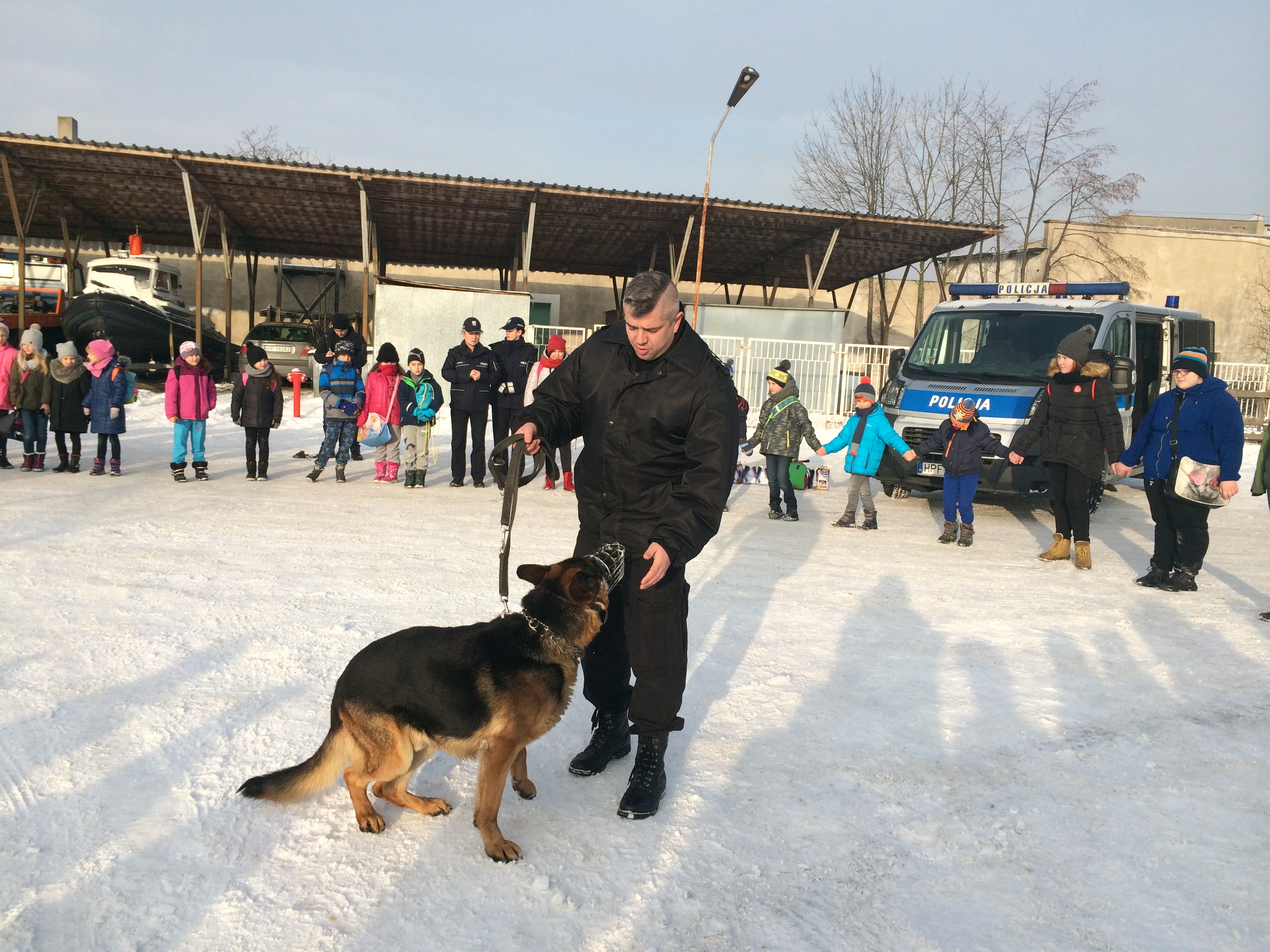 Na zakończenie cała grupa dzieci udała się na plac komendy, gdzie można było wsiąść w policyjne radiowozy. Pod bacznym okiem policjanta milusińscy mogli użyć sygnałów dźwiękowych i świetlnych. Mali goście poznali dzisiaj kolejnego pieska policyjnego o imieniu Arko. Opiekun czworonoga st.asp. Adam Żurek przekazał wiele ciekawych informacji o policyjnej pracy służbowego psa.
