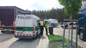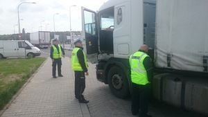 Zdjęcie trzech funkcjonariuszy w kamizelkach odblaskowych stojących przy samochodzie typu TIR -