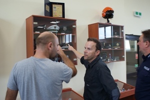 Zdjęcie trzech uczestników imprezy w pomieszczeniu - dwóch z nich pokazuje palcami gablotę z czapkami policyjnymi