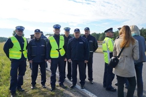 Zdjęcie siedmiorga umundurowanych uczetników imprezy z koordynatorką przedsięwzięcia z ramienia Wydziału Komunikacji Społecznej Komendy Wojewódzkiej Policji w Łodzi -