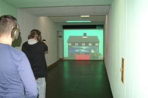 Zdjęcie dwóch uczestników ćwiczeń strzleckich w ochraniaczach - jeden celuje do wizerunku domu wyświetlonego na ekranie -